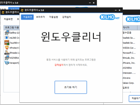 윈도우클리너(3.6.5) 가 업데이트되었습니다. 은행 접속시 강제로 설치해야 하는 보안(?) 프로그램들을 손쉽게 제거할 수 있습니다. 윈도우 기본 프로세서와 동일한 파일명으로 만든 악성프로그램도 깔끔하게 종료합니다. 필수적인 드라이버(그래픽, 사운드)는 종료하지 않습니다.(드라이버를 종료하면 성능이 떨어질 수 있습니다.) 신뢰할 수 있는 백신은 종료하지 않습니다. 익스플로어를 느리게 하는것(툴바 등)을 쉽게 중지할 수 있습니다. 설치 없이 사용 가능합니다. 다운로드길호넷에서 다운로드하기 홈페이지 윈도우클리너 : https://kcleaner.kilho.net 히스토리버전 3.6.5 -...