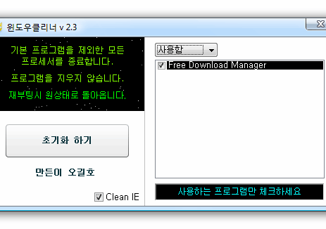 오랜만에 업데이트를 하여 배포합니다. 이번 버전의 핵심(?) 은 IE 에 연결되어 사용되는 툴바와 같은 플러그인을 제외하면서 웹서핑을 보다 빠르고 안전하게 하실 수 있습니다. (Clean IE 를 체크하신 후, 반드시 사용할 플러그인만 체크하고 "초기화하기" 를 클릭하세요!!)   기능을 추가하게 된 동기를 간단히 적었습니다 윈도우클리너에서 초기화를 통해 악성프로그램(??) 들이 종료를 시키는데, 이때 브라우저가 실행되면서 특정 플러그인...