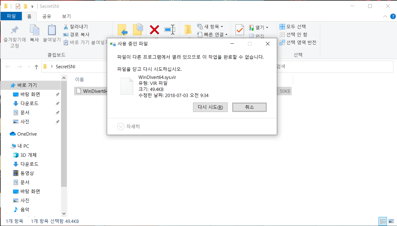 WinDivert64.sys.vir만 삭제되지않고 폴더에 남아있는데 이게 삭제가 되질 않습니다.