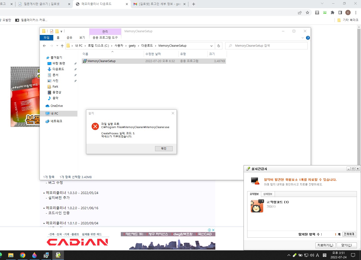 메모리클리너가 설치되지 않습니다. 3 22-07-19