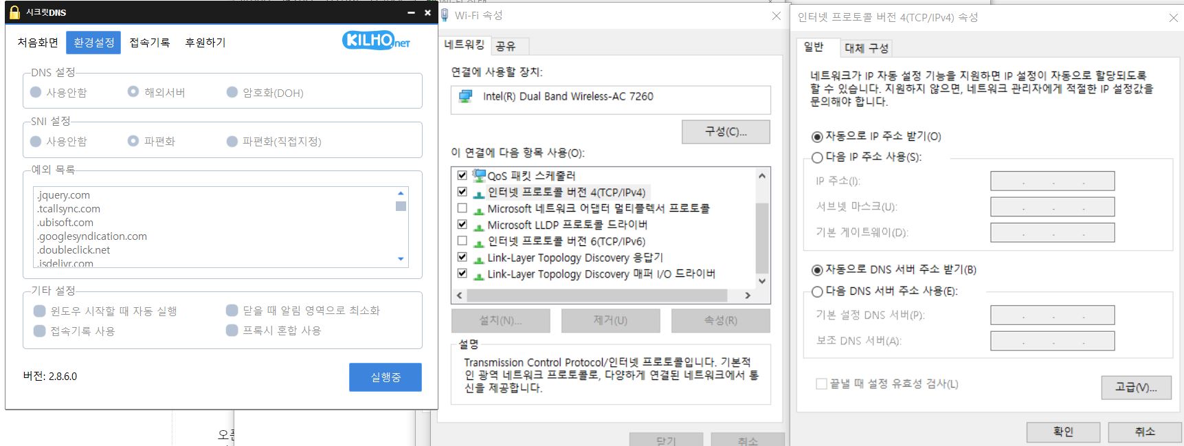 시크릿DNS 프로그램 설정을 이리저리 조절해봐도 와이파이 연결 시엔 여전히 우회가 되질 않는군요