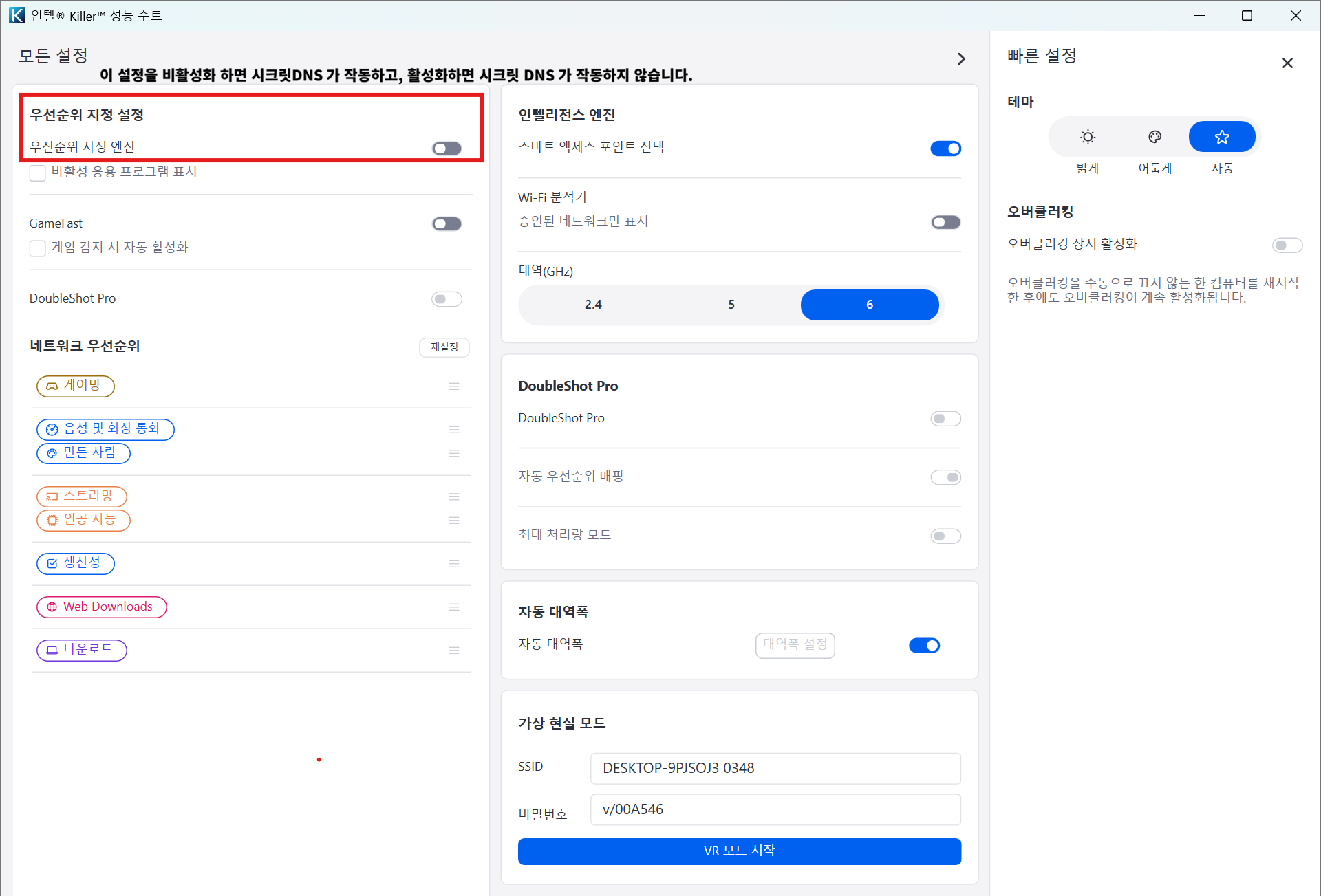 - Intel® Killer™ Performance Suite 설정 중, [우선순위 지정 설정] 을 활성화하면 시크릿DNS 가 작동하지 않고, 비활성화하면 시크릿DNS 가 작동함.