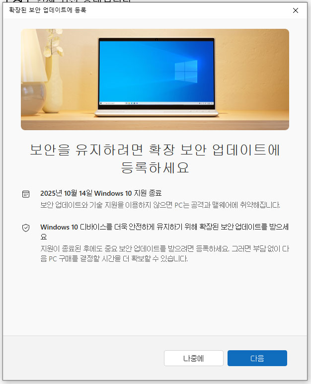 윈도우 10의 공식 지원이 종료되면 보안 업데이트가 중단됩니다.